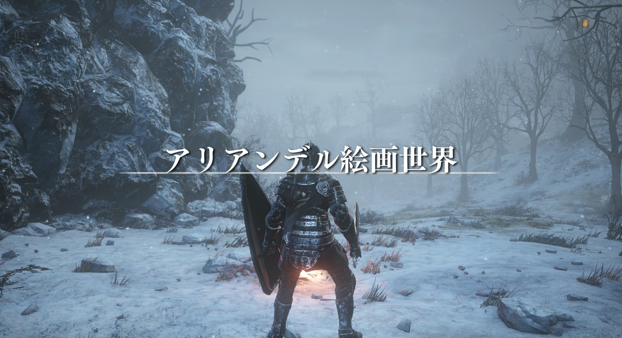 「深みの聖堂」エリア、 篝火「清拭の小教会」からスタートしよう 篝火横のNpcおじさんと、何度か話す。「願いを聞く」を選択することで、 新しいエリア「アリアンデル絵画世界」の篝火「雪原」付近へ行ける。 ※Npcが消えていない場合、一度篝火で他エリアへ移動してから再度入りなおす.